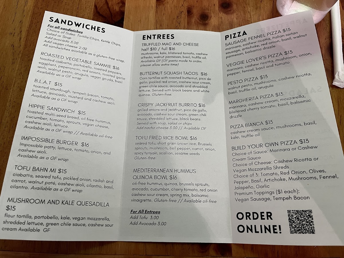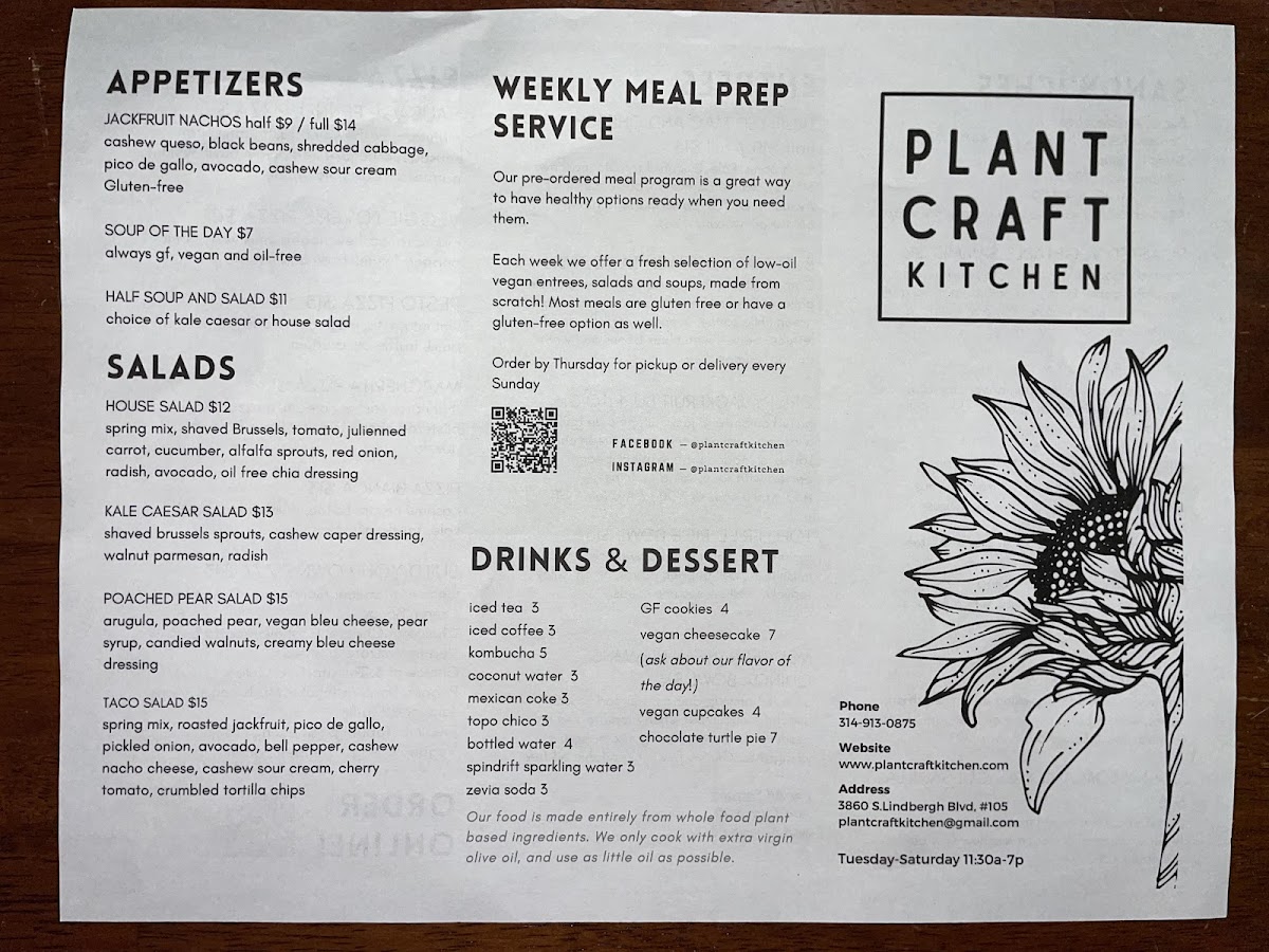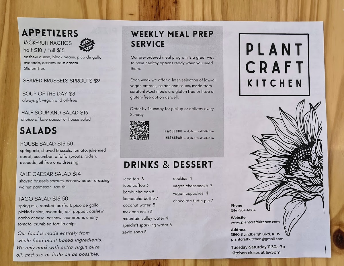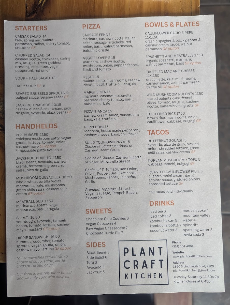Overall, the menu at Plant Craft Kitchen offers a satisfying variety of plant-based options that feel both creative and approachable. Starters like the House Salad and Taco Salad set a fresh tone, while lighter combinations such as the 1/2 Soup & Salad or Soup of the Day make for easy, comforting choices. The sandwich lineup stands out with hearty picks like the Red Bean Burger, Impossible Burger, and the flavorful B.L.A.T., alongside more unique options like the Hippie Sandwich and Portobello and Kale Quesadilla. For more filling dishes, the entrees deliver bold, satisfying flavors, particularly the indulgent Truffled Mac & Cheese, the crowd-pleasing Jackfruit Nachos and Jackfruit Burrito, and globally inspired plates like the Tofu & Veggie Fried Rice and Mediterranean Hummus and Quinoa Bowl. The 8" Personal Pizzas-including the Sausage Fennel Pizza, Veggie Lover's Pizza, Margherita Pizza, and Pizza Bianca-round out the menu nicely, offering familiar favorites with a plant-based twist. Even without listed prices, the menu feels thoughtfully curated, balancing comfort food with healthier options, making it appealing to both vegans and curious newcomers alike.