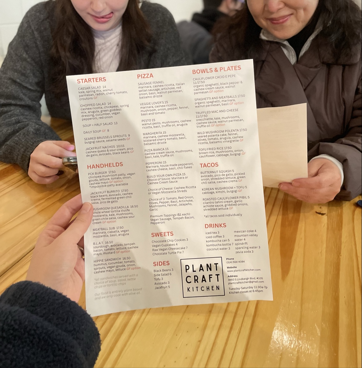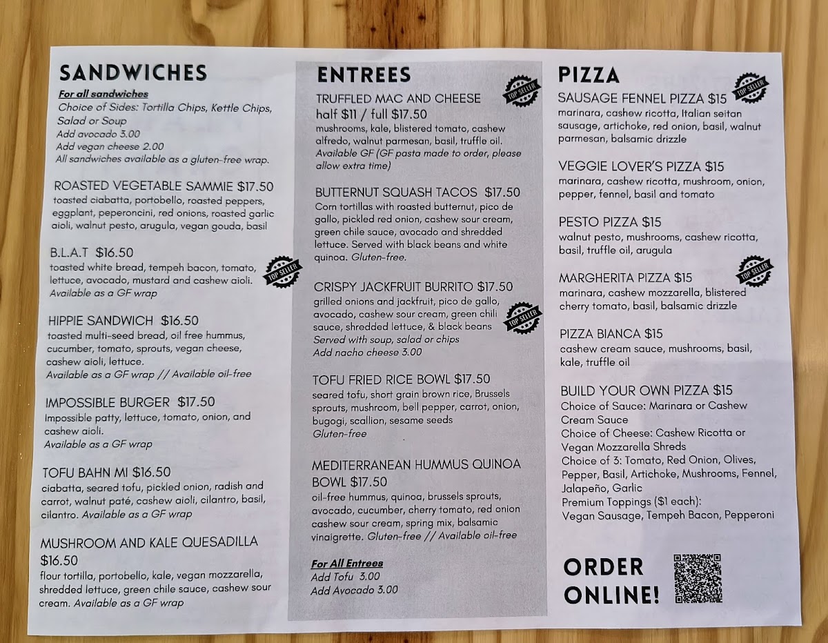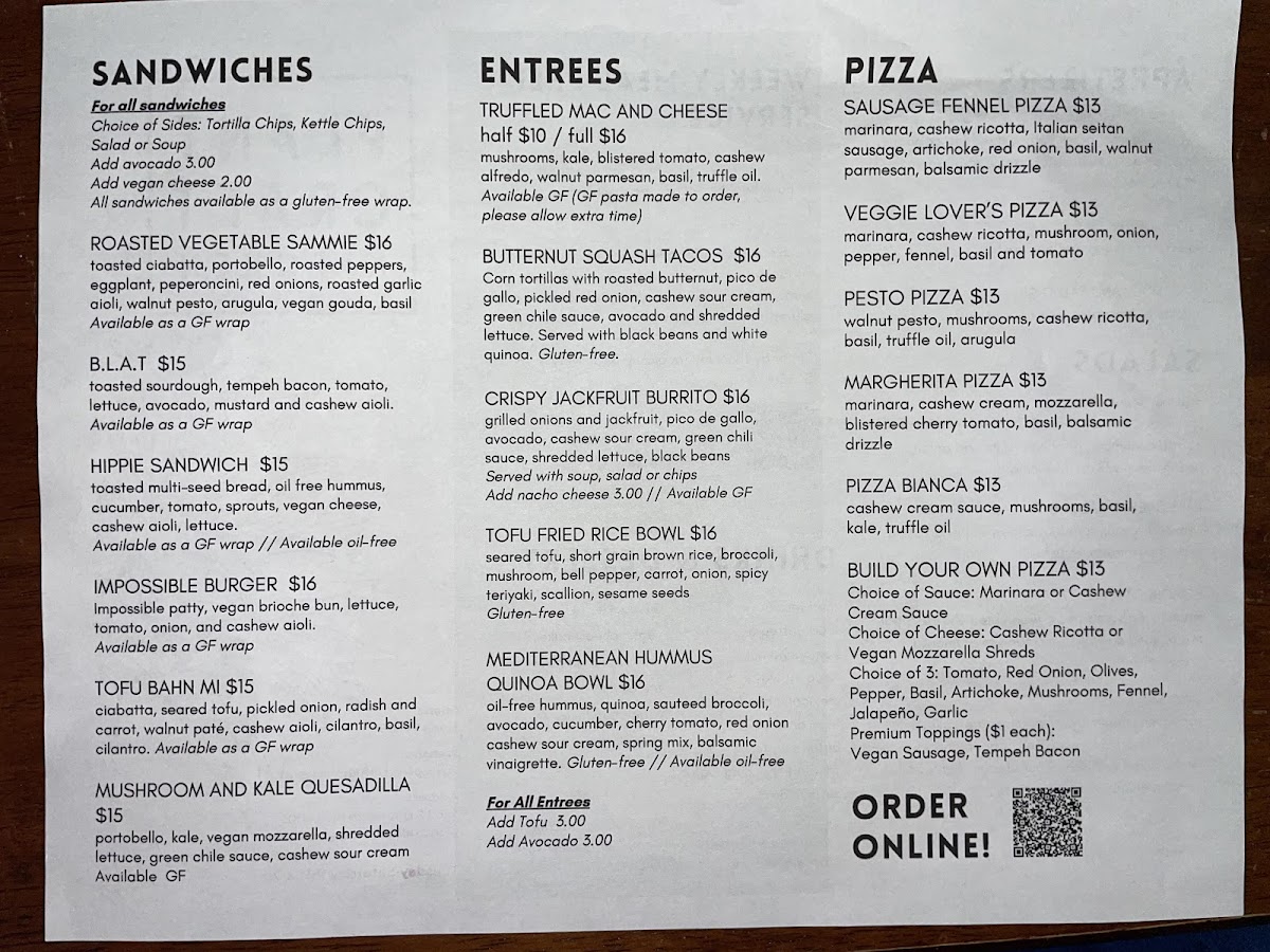 Overall, the menu at Plant Craft Kitchen offers a satisfying variety of plant-based options that feel both creative and approachable. Starters like the House Salad and Taco Salad set a fresh tone, while lighter combinations such as the 1/2 Soup & Salad or Soup of the Day make for easy, comforting choices. The sandwich lineup stands out with hearty picks like the Red Bean Burger, Impossible Burger, and the flavorful B.L.A.T., alongside more unique options like the Hippie Sandwich and Portobello and Kale Quesadilla. For more filling dishes, the entrees deliver bold, satisfying flavors, particularly the indulgent Truffled Mac & Cheese, the crowd-pleasing Jackfruit Nachos and Jackfruit Burrito, and globally inspired plates like the Tofu & Veggie Fried Rice and Mediterranean Hummus and Quinoa Bowl. The 8" Personal Pizzas-including the Sausage Fennel Pizza, Veggie Lover's Pizza, Margherita Pizza, and Pizza Bianca-round out the menu nicely, offering familiar favorites with a plant-based twist. Even without listed prices, the menu feels thoughtfully curated, balancing comfort food with healthier options, making it appealing to both vegans and curious newcomers alike.